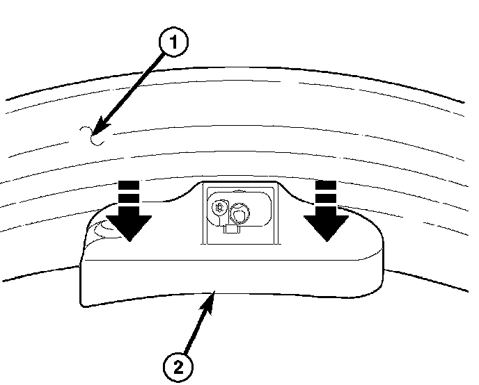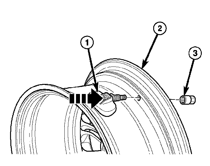 2. Insert sensor (1) through wheel (2) as shown keeping pressure against rear of metal valve stem (See Arrow). Potted side of sensor is to be positioned toward wheel. Do not attempt to mount sensor otherwise, damage may occur.