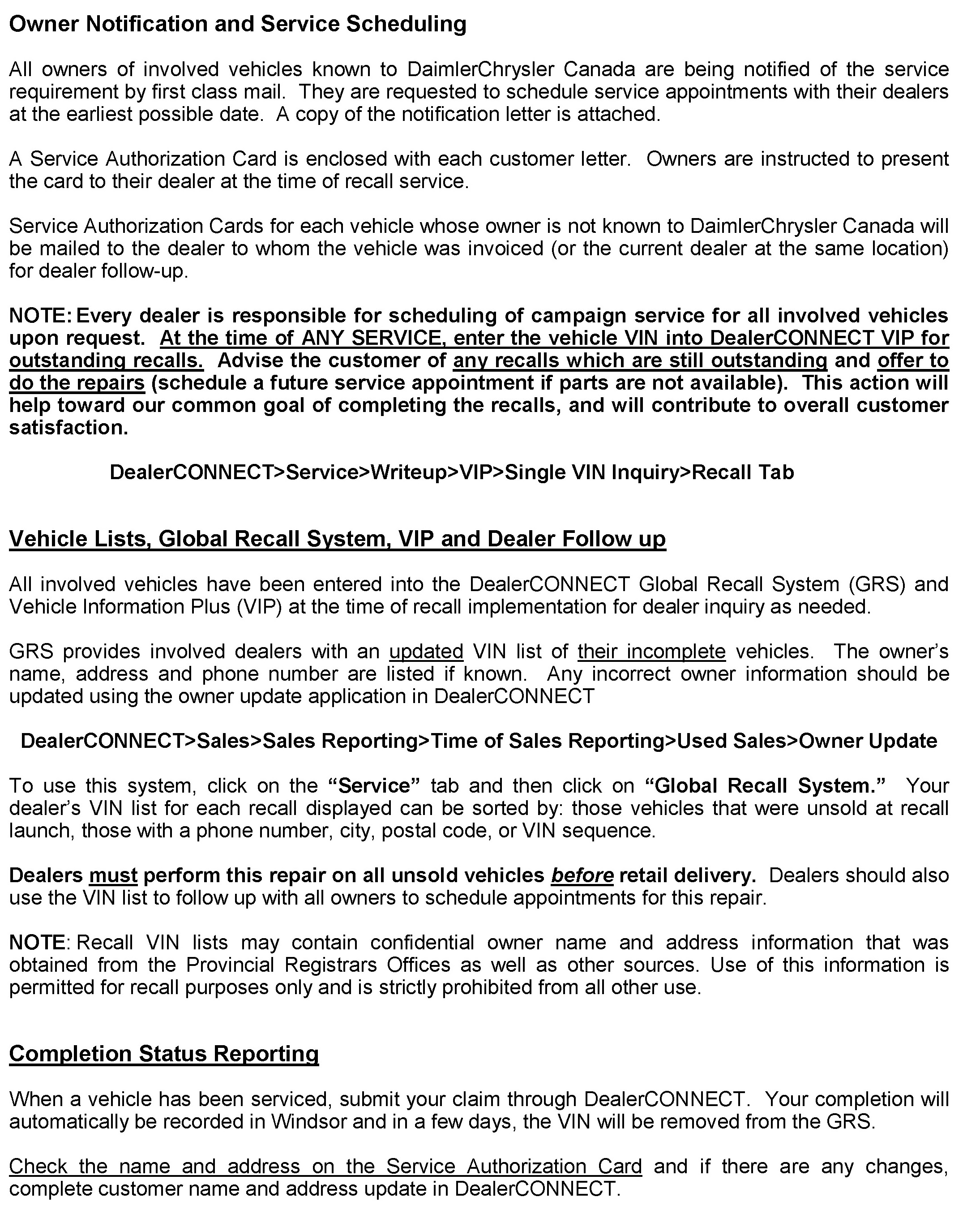 Global Recall System (GRS) has been developed to provide dealers with an up-to-date list of involved vehicles by recall number and by dealer code. Owners known to DaimlerChrysler are also listed. Involved vehicles will be removed from GRS within several days of submitting repair claims.