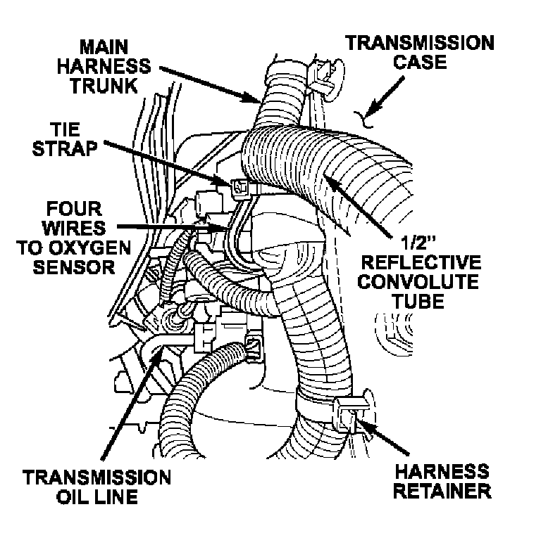19. Tie strap the excess length of the repaired oxygen sensor wiring to the main trunk of the powertrain harness just above the mounting bracket of the transmission as shown in Figure 4.
