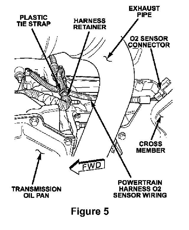 26. Tie strap the excess length of the repaired oxygen sensor wiring to the main trunk of the powertrain harness just above the mounting bracket of the transmission as shown in Figure 5.