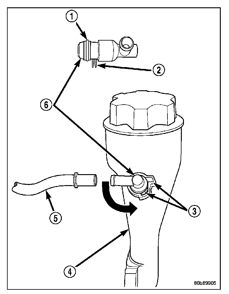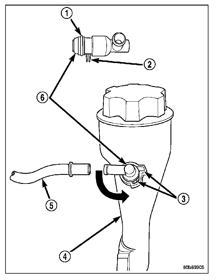 REMOVALThe PCV valve (6) is located on the oil filler tube (4). Two locating tabs (2) are located on the side of the valve. These 2 tabs fit into a cam lock in the oil filler tube. An O-ring seals the valve to the filler tube.
