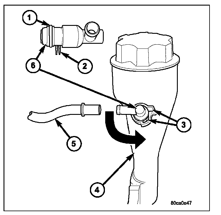9. Return PCV valve back to oil filler tube by placing valve locating tabs (2) into cam lock (3). Press PCV valve in and rotate valve upward. A slight click will be felt when tabs have engaged cam lock. Valve should be pointed towards rear of vehicle.