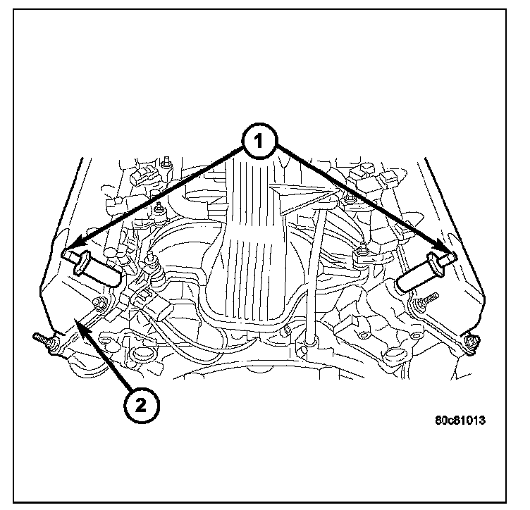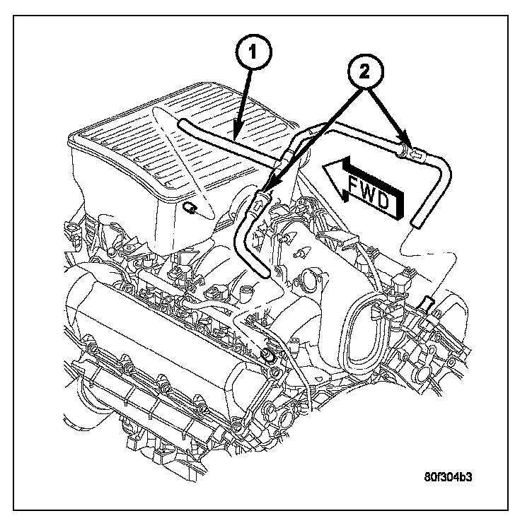 15. If vacuum is still not present, disconnect each PCV system hose (1) at each fitting, and at each check valve (2). Check for obstructions or restrictions.