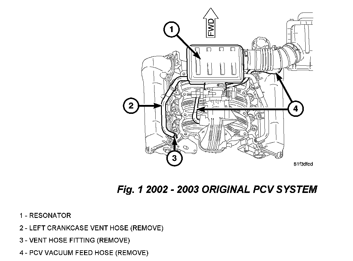 1. Remove the PCV crankcase vent hose that runs from the resonator to the rear of the LEFT cylinder head (Fig. 1).