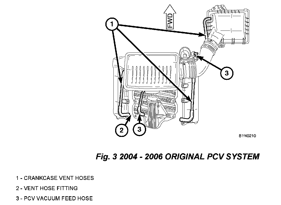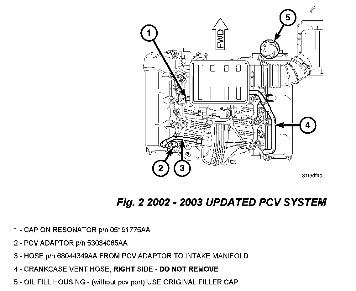 6. Install PCV Hose p/n 68044349AA from PCV adaptor to original PCV hose port on intake manifold (Fig. 2).