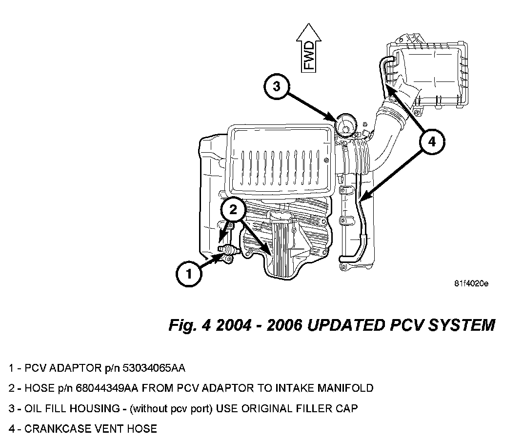 5. Install PCV Hose p/n 68044349AA from PCV adaptor to original PCV hose vacuum port on intake manifold (Fig. 4).