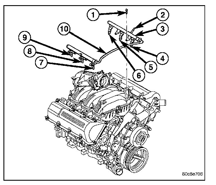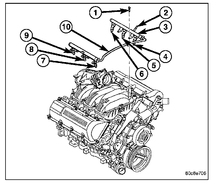 REMOVALWARNING: THE FUEL SYSTEM IS UNDER CONSTANT PRESSURE EVEN WITH ENGINE OFF. BEFORE SERVICING FUEL RAIL, FUEL SYSTEM PRESSURE MUST BE RELEASED.