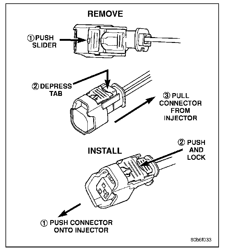 8. Disconnect electrical connectors at all 6 fuel injectors. Push red colored slider away from injector (1). While pushing slider, depress tab (2) and remove connector (3) from injector. The factory fuel injection wiring harness is numerically tagged (INJ 1, INJ 2, etc.) for injector position identification. If harness is not tagged, note wiring location before removal.