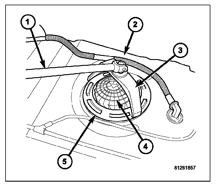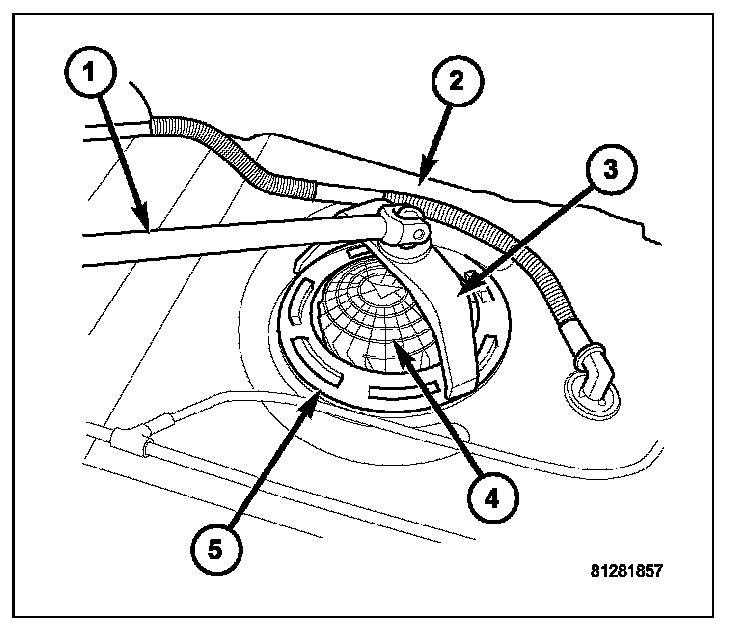 The fuel pump module (2) and pump module lock ring (1) are located on the top of the fuel tank.