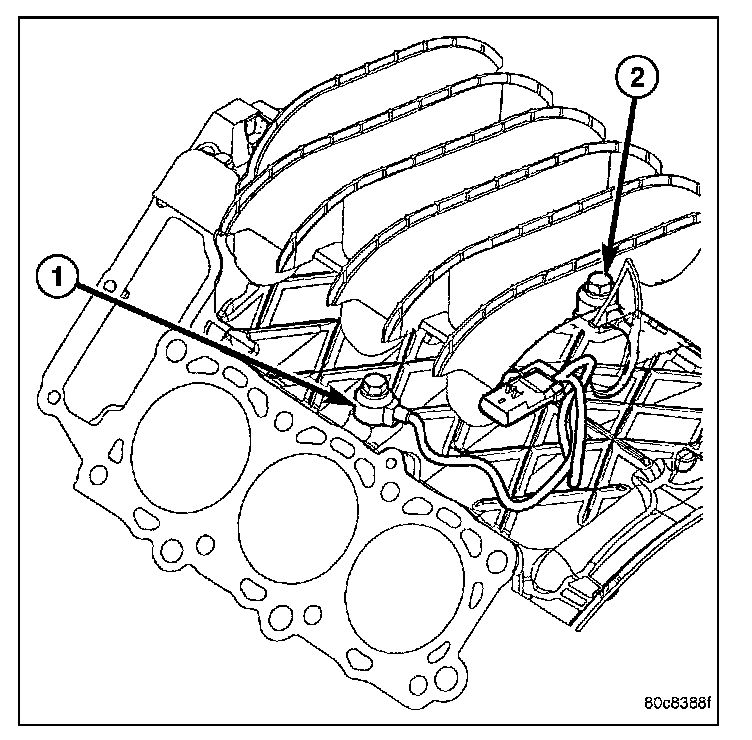 The two knock sensors (1) and (2) are bolted into the cylinder block under the intake manifold.