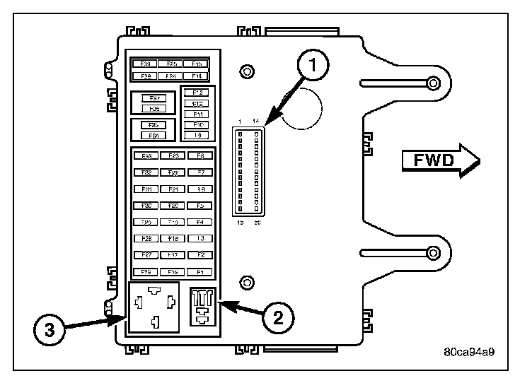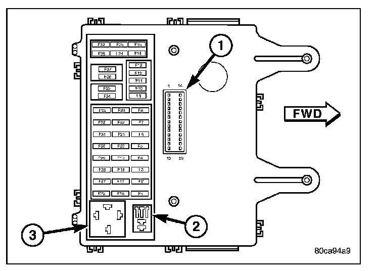 1. Position the headlamp high beam relay to the proper receptacle (2) in the Junction Block (JB).