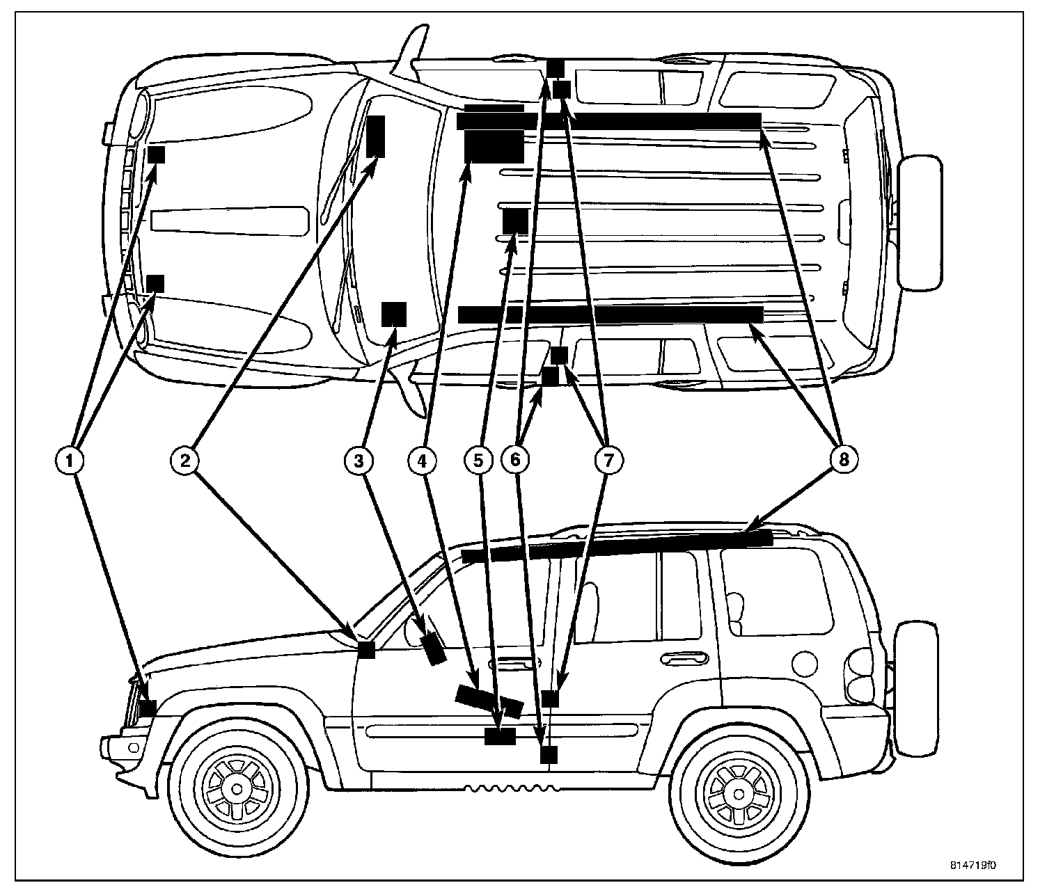 - Side Curtain Airbag (8) - In vehicles equipped with this option, a side curtain airbag is secured to each inside roof side rail, and extends from the A-pillar to just beyond the C-pillar. The side curtain airbags are concealed above the headliner trim.
