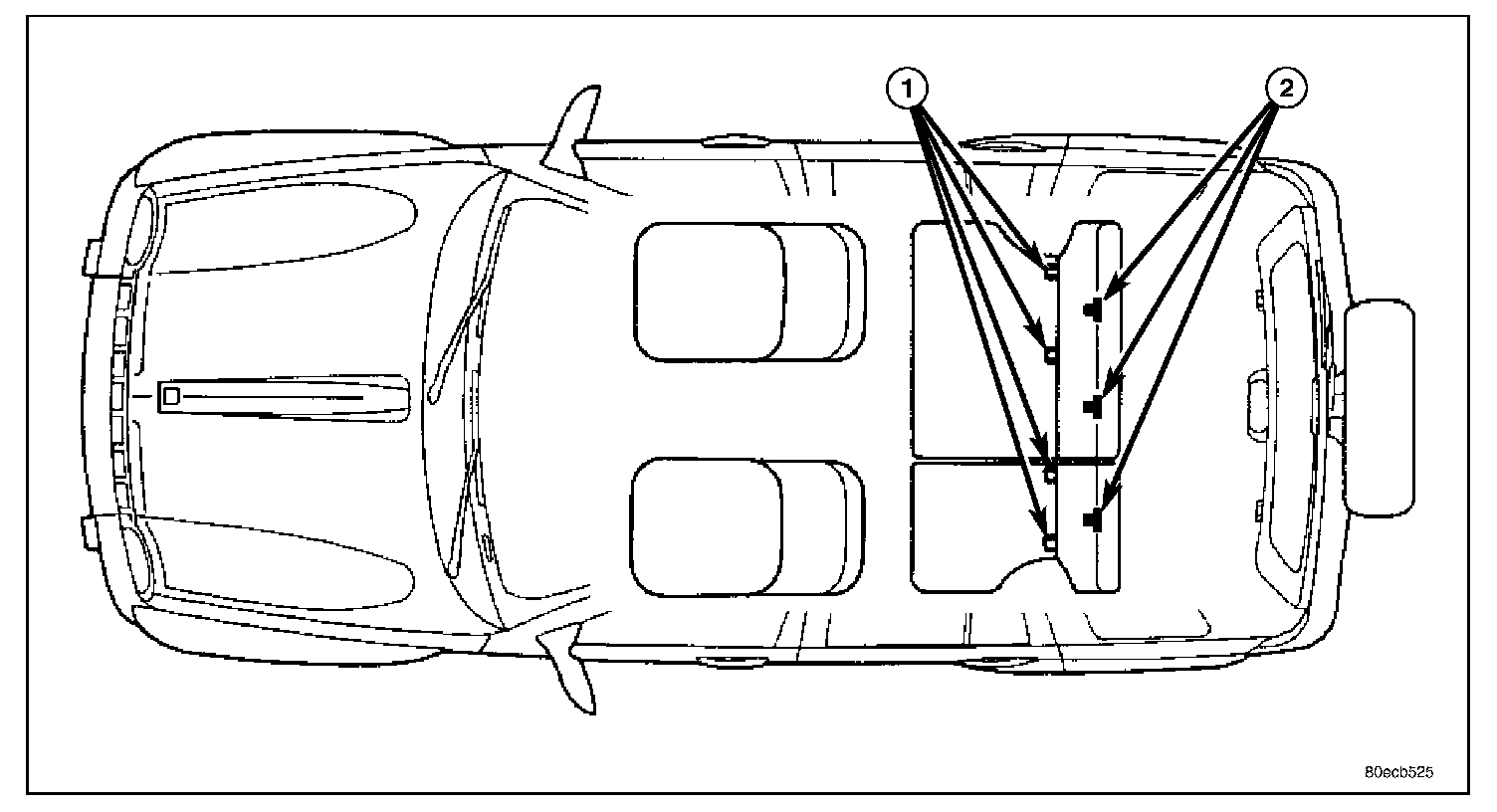 This model is equipped with a Lower Anchors and Tether for Children, or LATCH child restraint anchorage system. The LATCH system provides for the installation of suitable child restraints in certain seating positions without using the standard equipment seat belt provided for that seating position. The rear seats in this model are equipped with a fixed-position child restraint upper tether anchor (2) for both the center and the two outboard seating positions, and child restraint lower anchors (1) for the two outboard seating positions only.