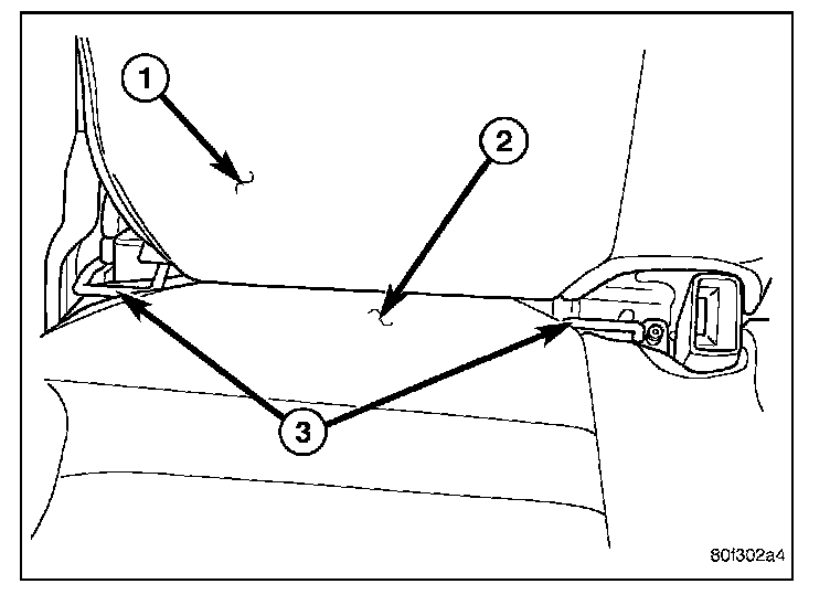 The three upper tether anchors are integral to the rear seat back panels. Two anchors are integral to the back of the right rear seat back panel (2), and one is integral to the left rear seat back panel (1). These anchors are each constructed from a short piece of heavy-gauge steel wire stock that is securely welded into a stamped cup integral to the seat back panel. There is a separate molded plastic trim bezel (3) located around each of the three anchors. The child restraint upper tether anchors cannot be adjusted or repaired and, if faulty or damaged, they must be replaced as a unit with their respective rear seat back panels.