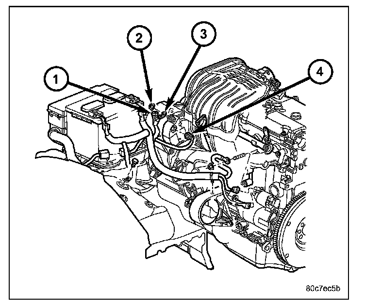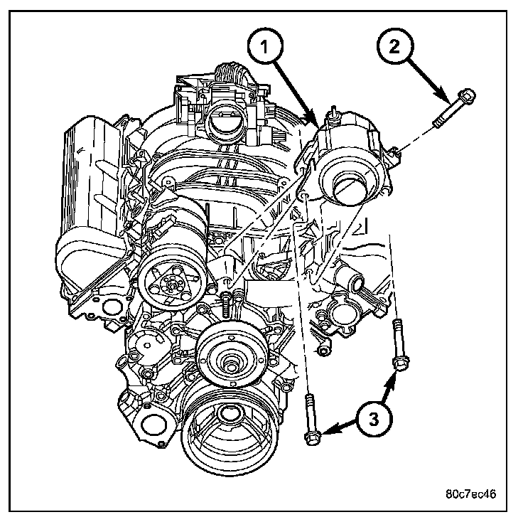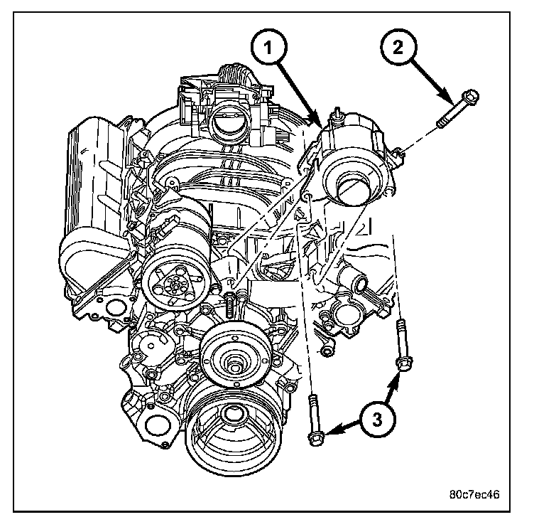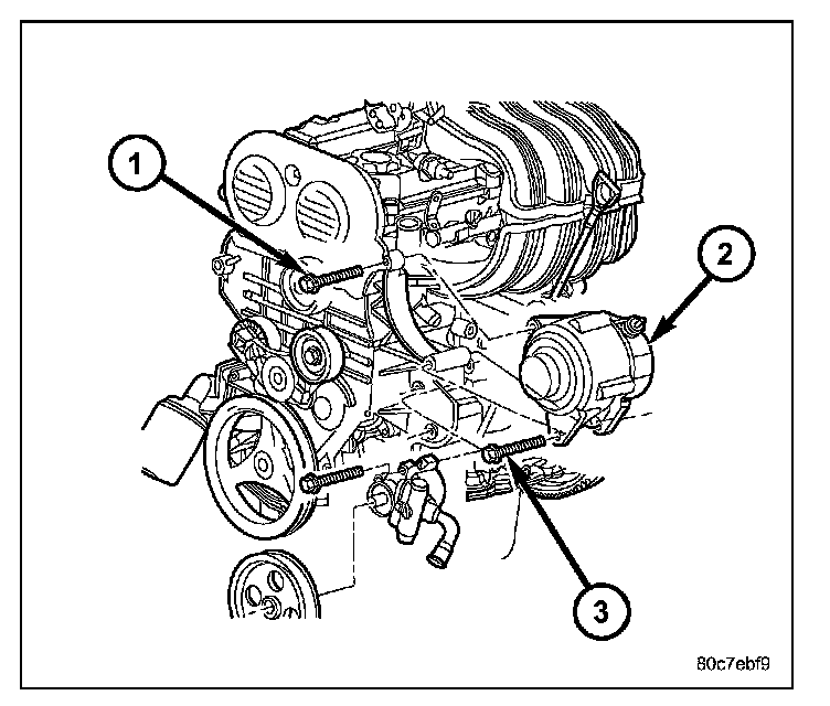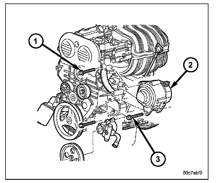 2. 3.7L Engine: Position generator to engine and install three mounting bolts (2) and (3). Tighten 2 horizontal mounting bolts to specified torque. Tighten 1 vertical mounting bolt and tighten to 40 N.m (29 ft. lbs.)