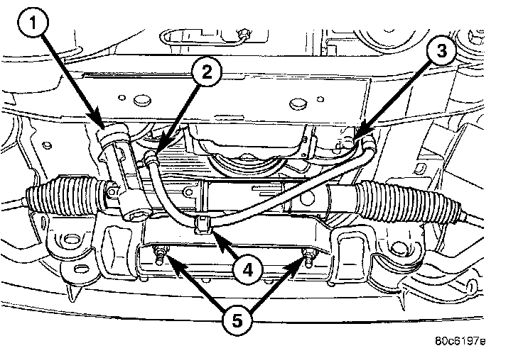 9. Remove the power steering lines (2) from the gear (1).