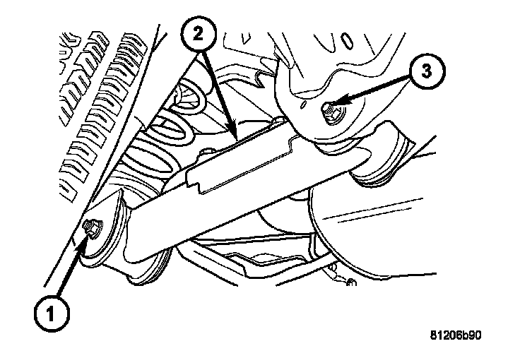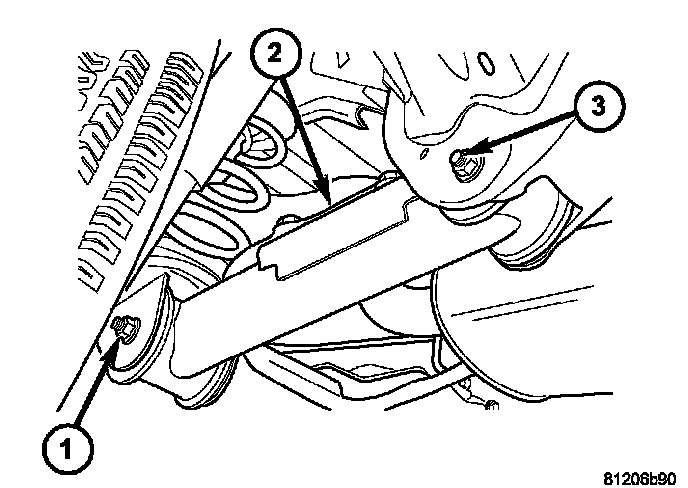 4. Remove the nut and bolt (3) from the frame rail (3) and remove the lower suspension arm (2).