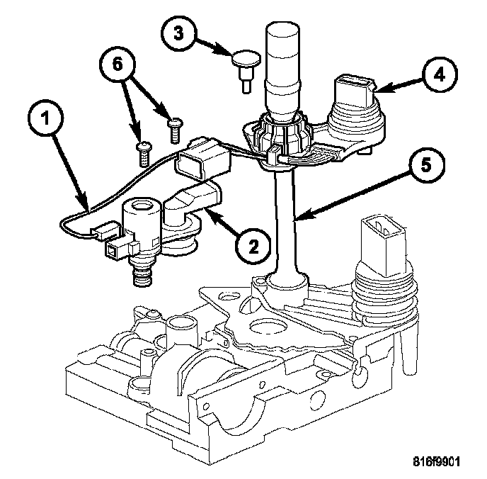 3. Remove the screws (6) holding the pressure control solenoid (1) and line pressure sensor (2) to the valve body.