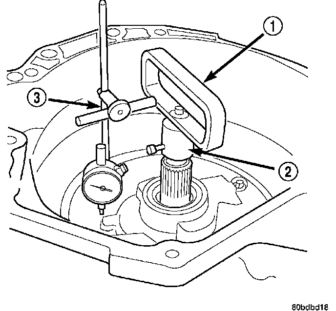 2. Measure input shaft end play using End Play Set 8266 (1, 2). Set up the required items from End Play Set 8266 and a dial indicator as shown.