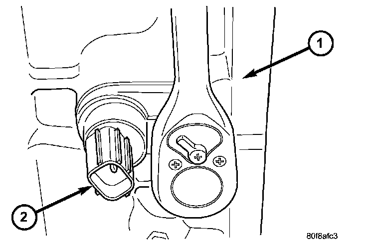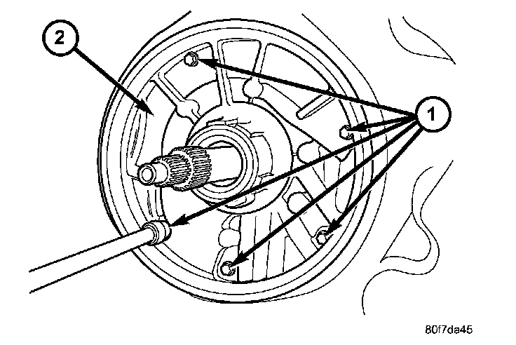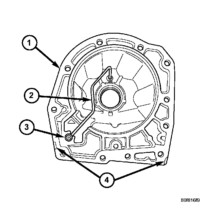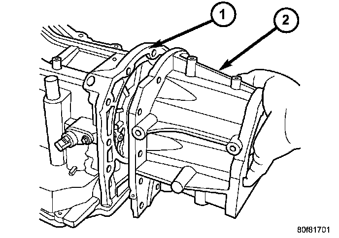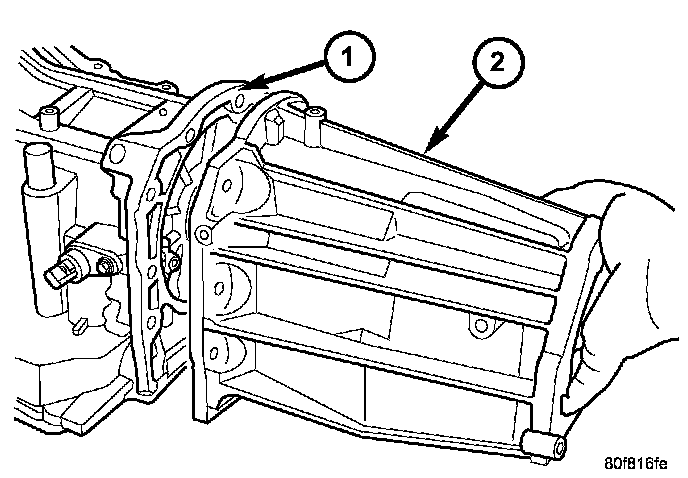 5. Remove the adapter (2) housing, 4X4 vehicles only, from the transmission case. There are two pry slots located near the bottom corners of the housing for separating the housing from the transmission case.