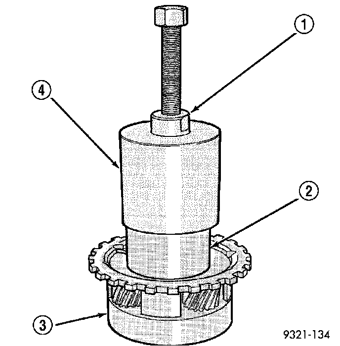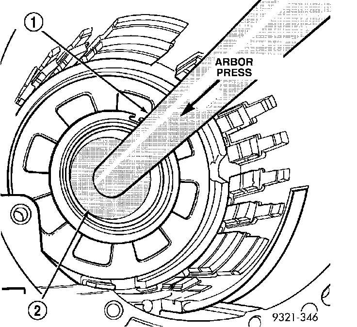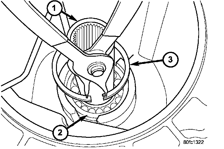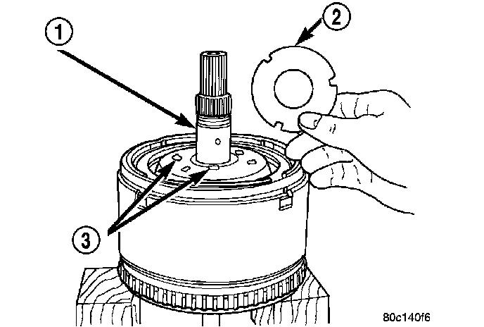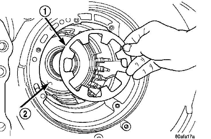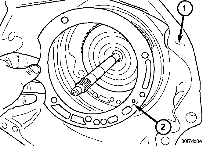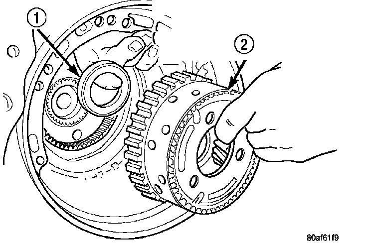 NOTE: The number seven needle bearing (1) has three anti-reversal tabs and is common with the number five and number two position. The orientation should allow the bearing to seat flat against the rear sun gear. A small amount of petrolatum can be used to hold the bearing to the rear sun gear.