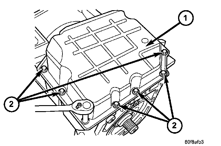 14. Remove the transmission oil pan bolts (2).