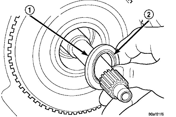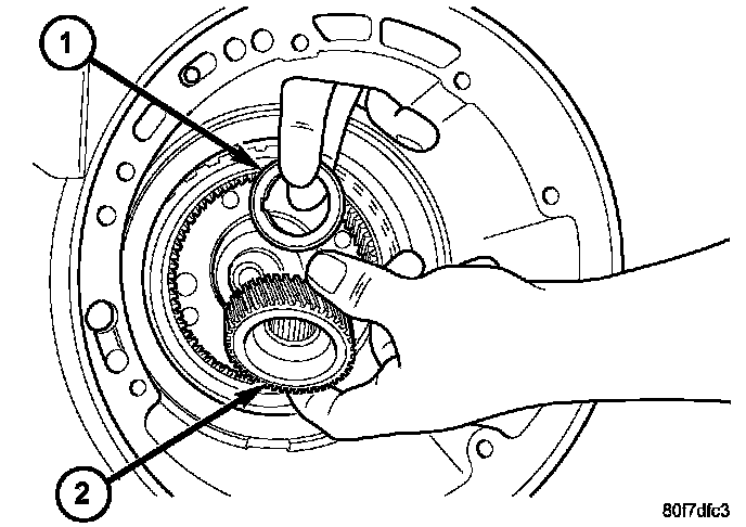 36. Remove the rear sun gear (2) and #7 needle bearing (1).
