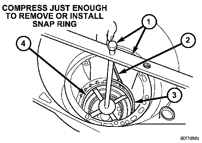 NOTE: Verify that Compressor 5058A (1) is centered properly over the 2/4 clutch retainer (4) before compressing. If necessary, fasten the Compressor 5058A bar to the bellhousing flange with any combination of locking pliers and bolts to center the tool properly.