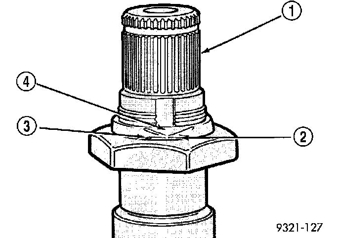 CAUTION: Failure to grind and open stakes (4) of the output shaft nut will result in thread damage to the shaft during nut removal.