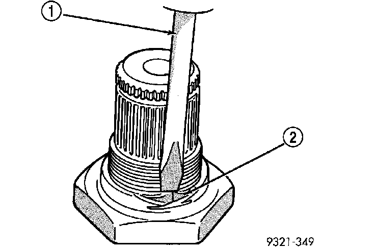 46. Using a die grinder or equivalent, grind the stakes in the shoulder of the shaft nut (2) as shown. Do not grind all the way through the nut and into the shaft. There are two stakes on each nut.