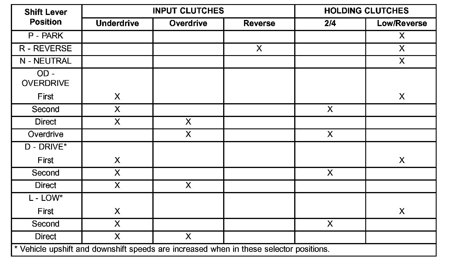 Slipping clutches can be isolated by comparing the "Elements in Use" chart with clutch operation encountered on a road test. This chart identifies which clutches are applied at each position of the selector lever.