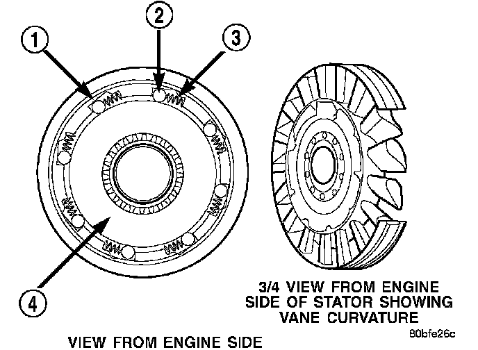 The stator contains an over-running clutch (1-4), which allows the stator to rotate only in a clockwise direction. When the stator is locked against the over-running clutch, the torque multiplication feature of the torque converter is operational.