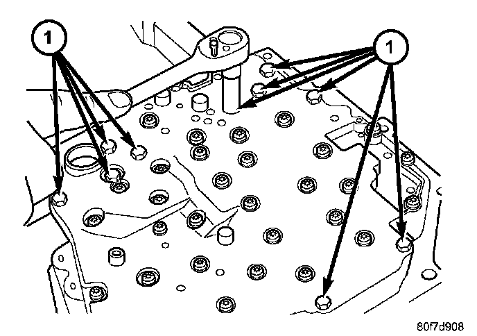 Torque valve body to transmission case bolts (1) to 12 Nm (105 inch lbs.) torque.