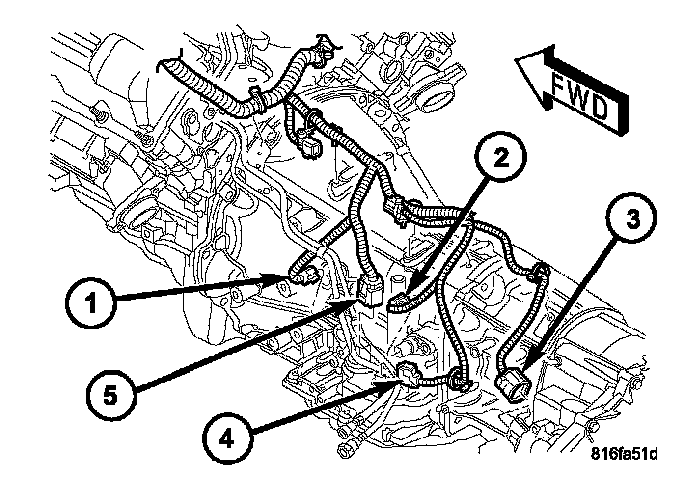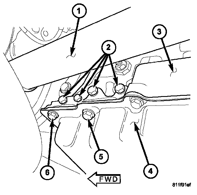 NOTE: Before installing the oil pan bolt in the bolt hole (5) located between the torque converter clutch on and U/D clutch pressure tap circuits, it will be necessary to replenish the sealing patch on the bolt using MOPAR(R) Lock & Seal Adhesive.