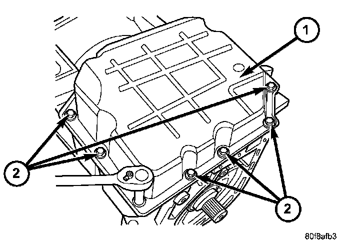 3. Make sure oil pan (1) and case rail are clean and dry. Install an 1/8" bead of RTV to the transmission oil pan and install to case. Tighten bolts (2) to 20 Nm (14.5 ft. lbs.).