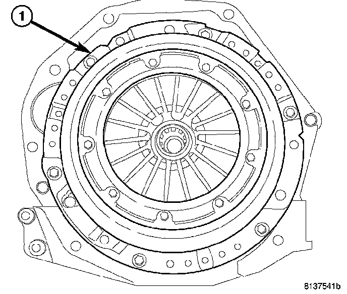 2. Mark position of pressure plate (1) on flywheel with paint or a scriber for assembly reference, if clutch is not being replaced.