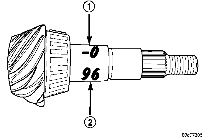 Ring gear and pinion are supplied as matched sets. Identifying numbers for the ring gear and pinion are painted onto the pinion gear shaft and the side of the ring gear. A plus (+) number, minus (-) number or zero (0) along with the gear set sequence number (2) (01 to 99) is on each gear. This first number (1) the amount (in thousandths of an inch) the depth varies from the standard depth setting of a pinion marked with a (0). The next two numbers are the sequence number of the gear set. The standard depth provides the best teeth contact pattern.