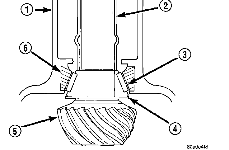 Compensation for pinion depth variance is achieved with select shims (4). The shims are placed behind the rear pinion bearing.