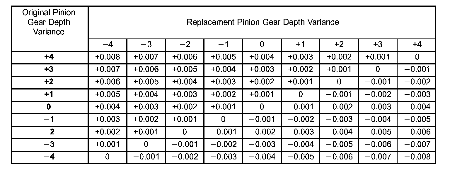 Pinion Gear Depth Variance Chart: Note where Old and New Pinion Marking columns intersect. Intersecting figure represents plus or minus the amount needed.