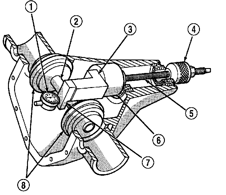 8. Slide the dial indicator probe across the gap between the pinion height block and the arbor bar (1) with the scooter block against the pinion height block. When dial probe contacts the arbor bar, the dial pointer will turn clockwise. Continue moving the dial probe to the crest of the arbor bar and record the highest reading. If the dial indicator can not achieve a zero reading, the rear bearing cup or the pinion depth gauge set is not installed correctly