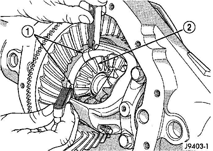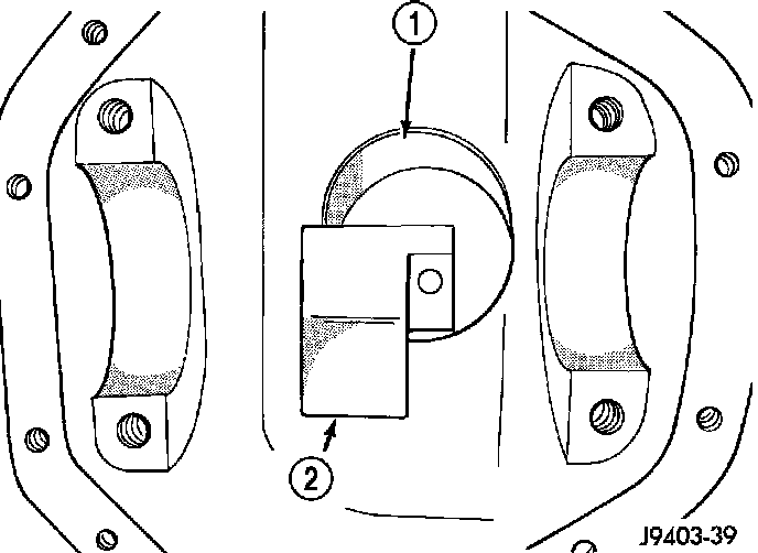 2. Measure each side gear clearance. Insert a matched pair of feeler gauge (1) blades between the side gear (2) and differential housing on opposite sides of the hub.