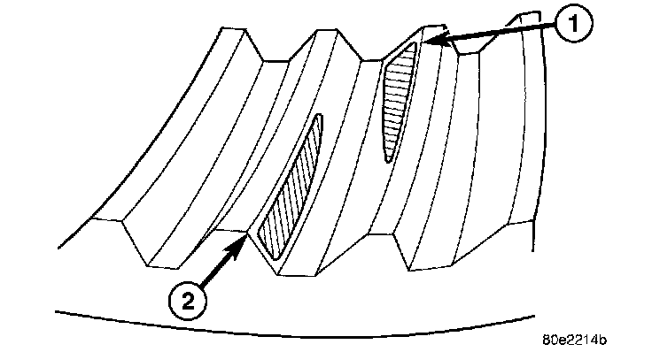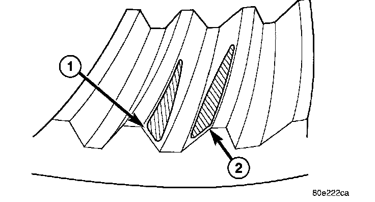 Ring gear is too close to the pinion gear, drive side toe (1) coast side heel (2). Increase backlash by moving ring away from the pinion gear using the adjusters.
