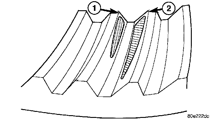 Ring gear is too far away from the pinion gear, coast side toe (1) drive side heel (2). Decrease backlash by moving ring closer to the pinion gear using the adjusters.