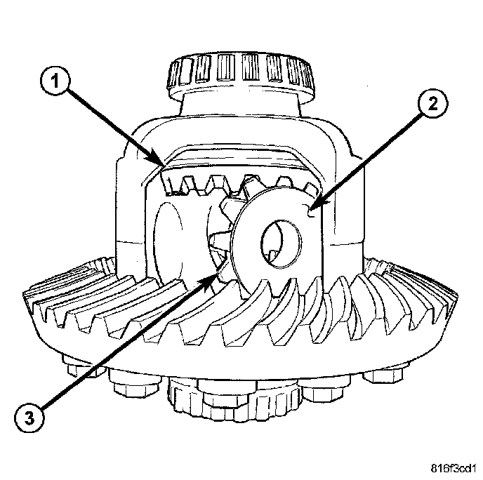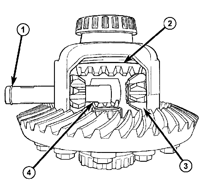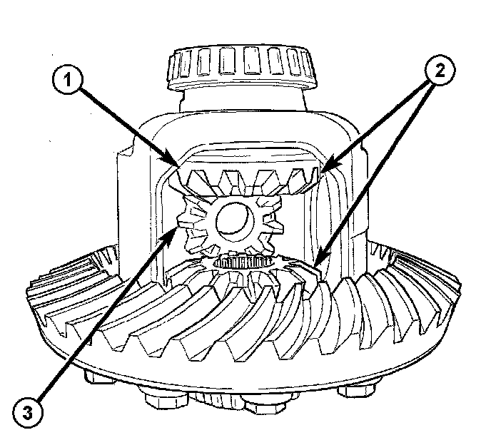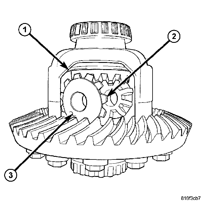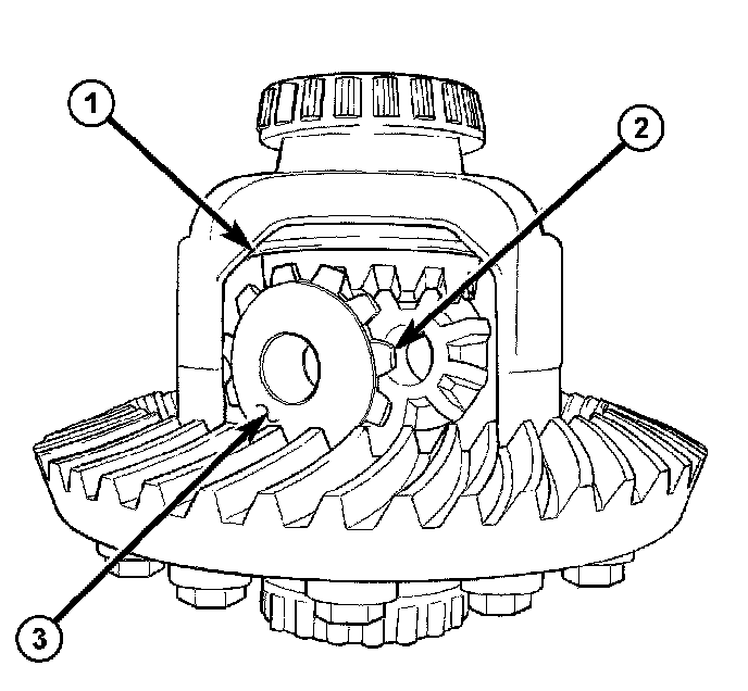1. Rotate one pinion gear (2) with thrust washer (3) to the differential window (1) and remove gear and thrust washer.