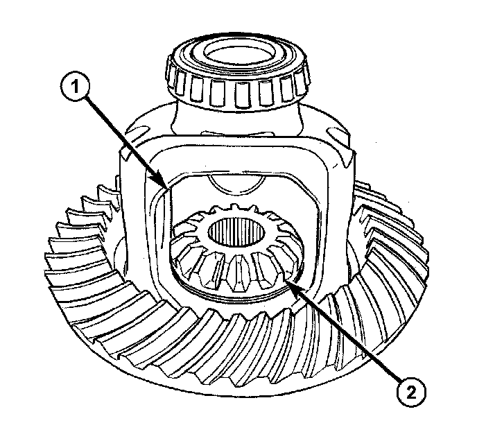 2. Install differential side gears (2) and thrust washers through differential window (1).