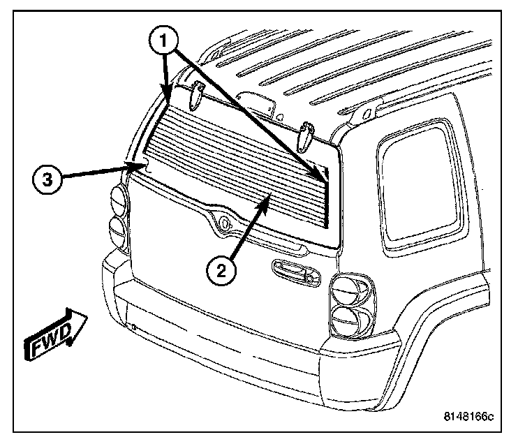 The rear window defogger system, also known as electric backlight (EBL), consists of two vertical bus bars (1) linked by a series of grid lines (2) fired onto the inside surface of the rear window (3).