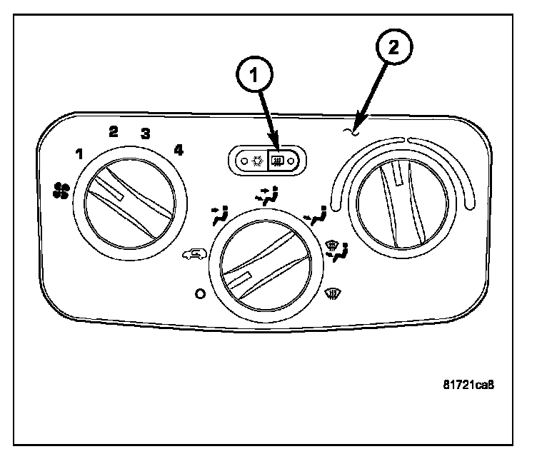 The electric backlight (EBL) system is controlled by a momentary switch (1) located in the A/C-heater control (2) In the instrument panel. When the rear window defogger switch is pressed to the On position, the body control module (BCM) energizes the rear window defogger (EBL) relay, which then directs fused battery current through the relay and to the rear defogger grid lines and the heated side view mirrors, when equipped. The grid lines heat the glass to help clear the rear window and side mirror surfaces of fog or frost.