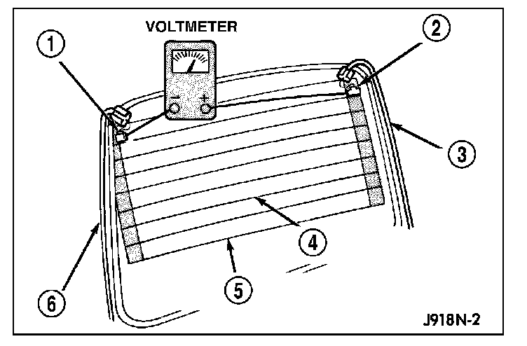 3. If a temperature difference is not detected, use a 12-volt DC voltmeter and contact the rear glass heating grid terminal A (1) with the negative lead, and terminal B (2) with the positive lead. The voltmeter should read battery voltage. If the voltmeter does not read battery voltage, check the following:
