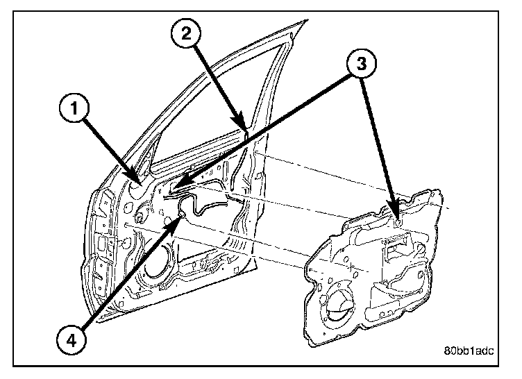 3. Raise the glass (4) to the position shown and using a long flat blade or hook type tool, disengage clips (1) attaching glass retainer to regulator lift plate (3).