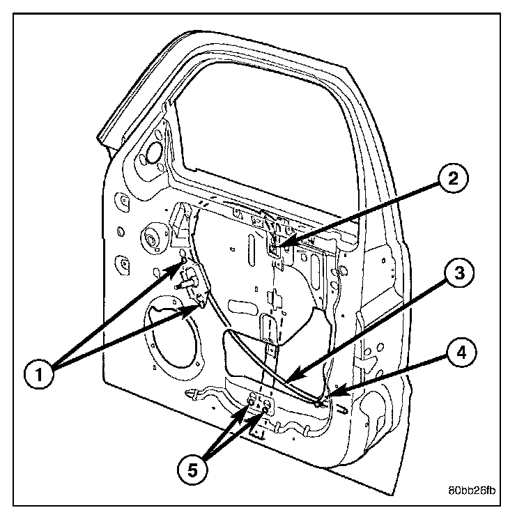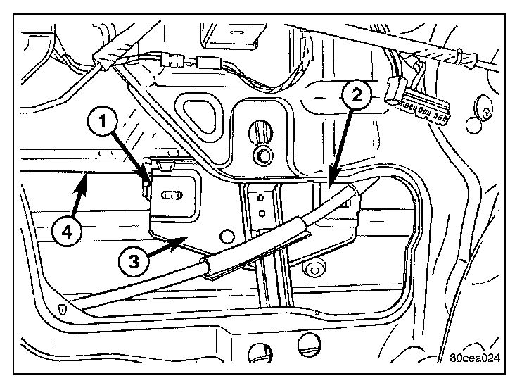2. Raise the glass (4) to the position shown and using a long flat blade or hook type tool, disengage clips (1) attaching glass retainer to regulator lift plate (3).